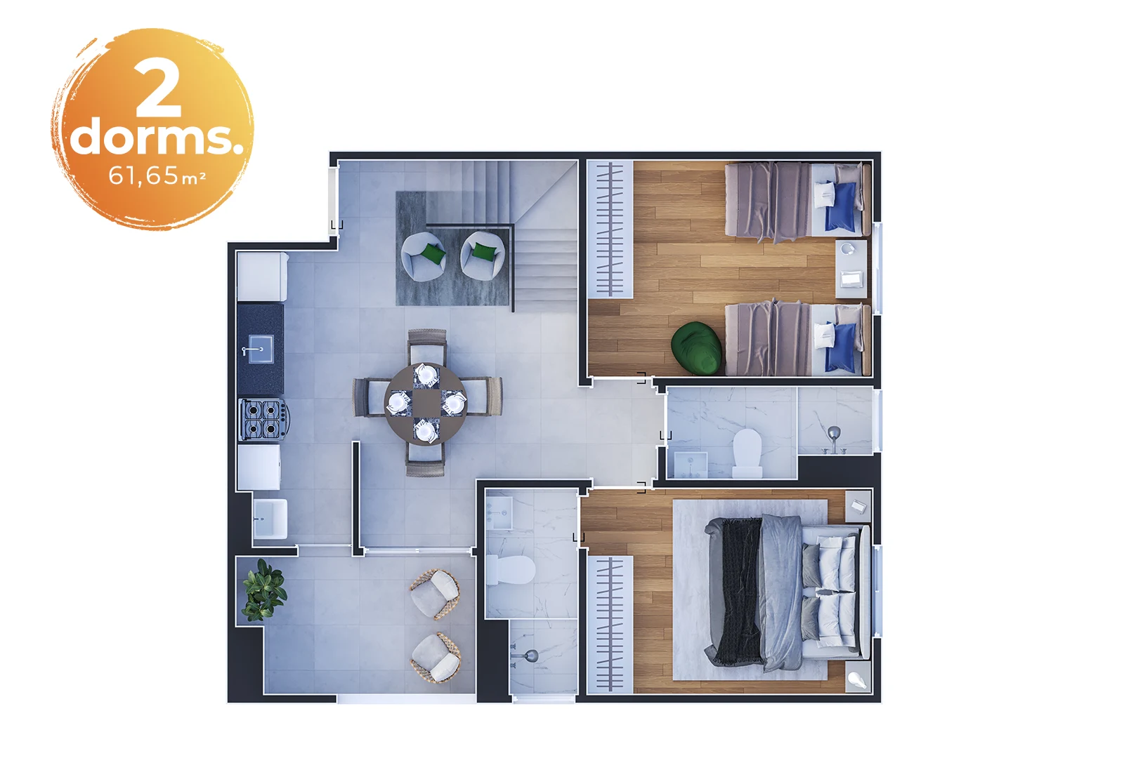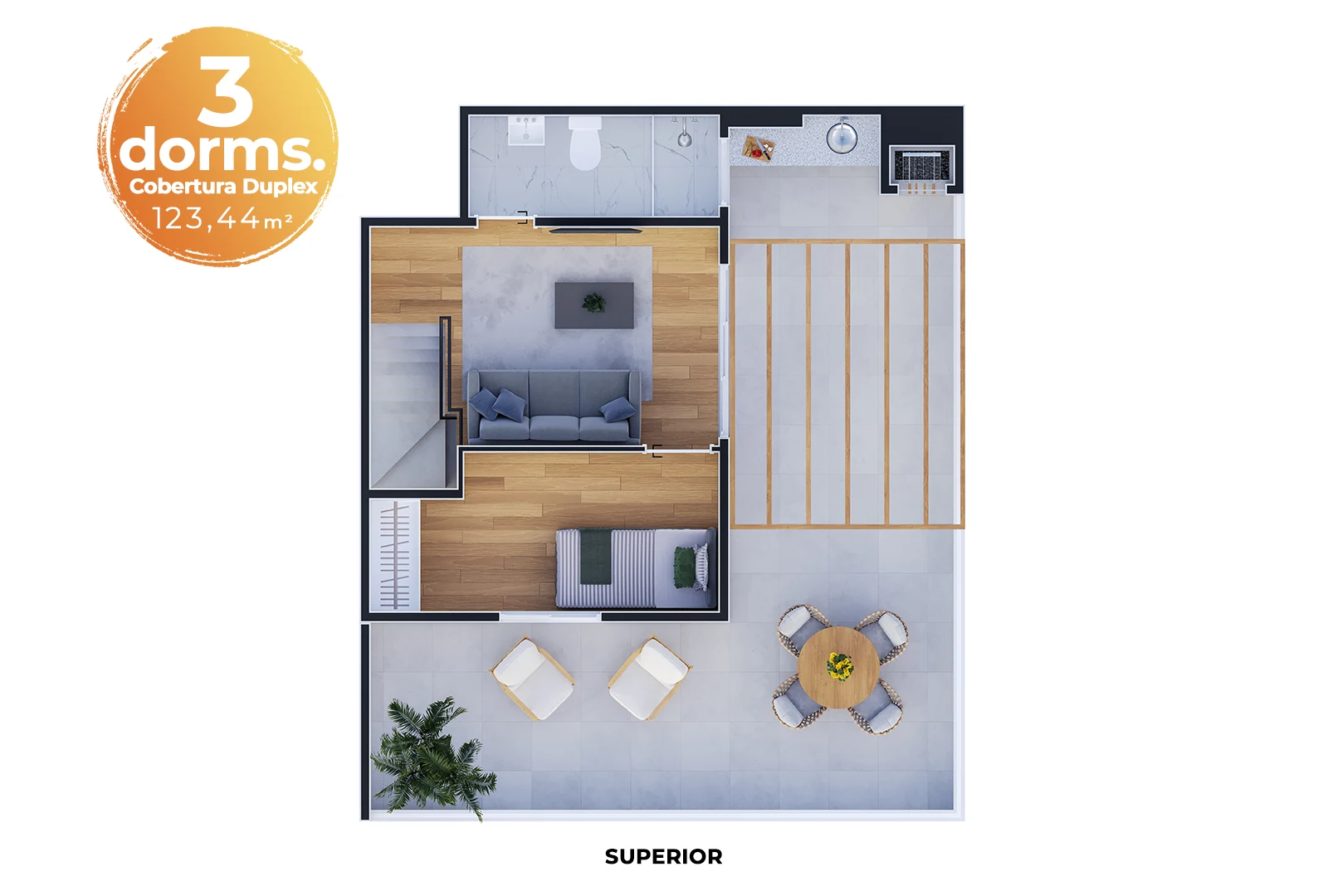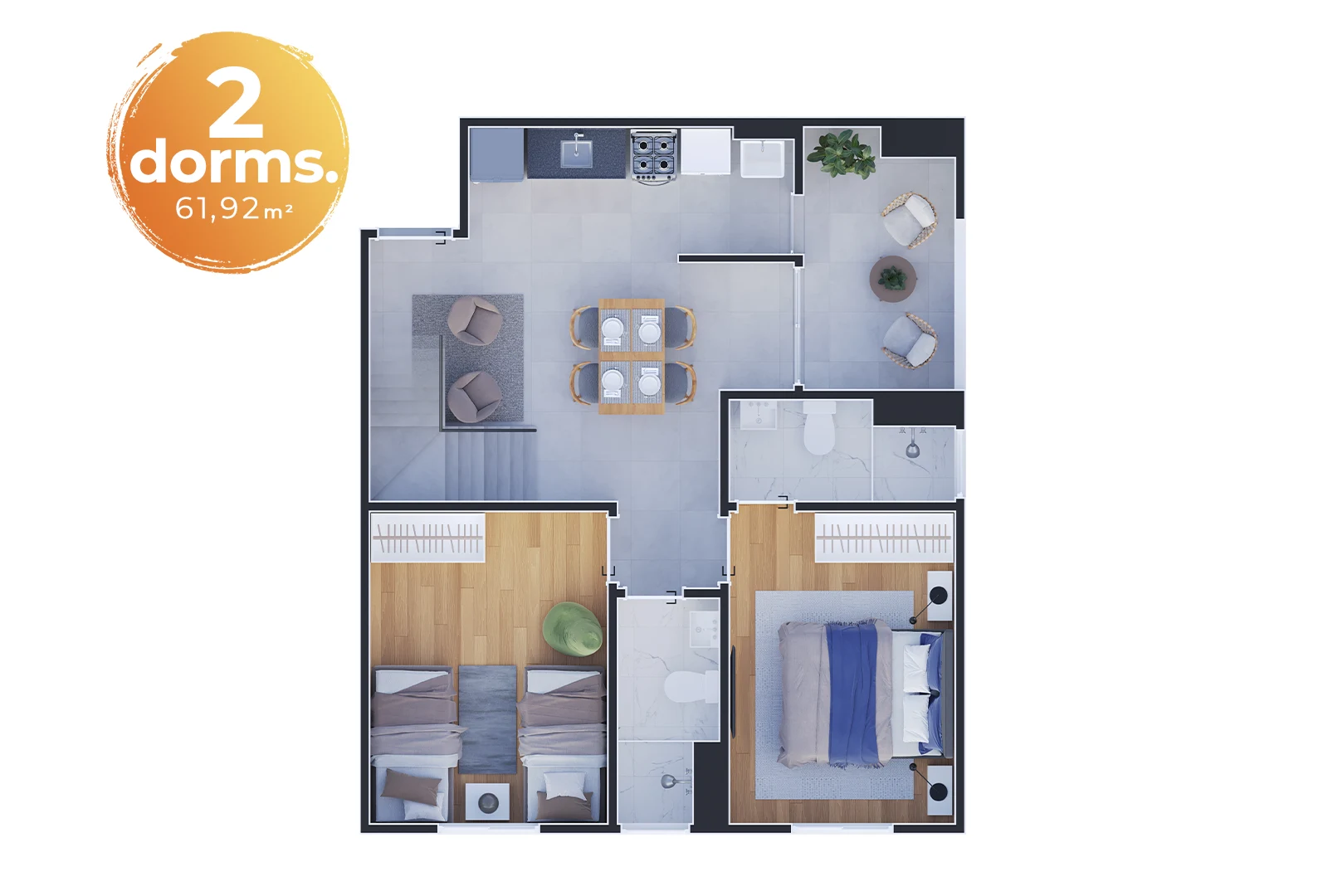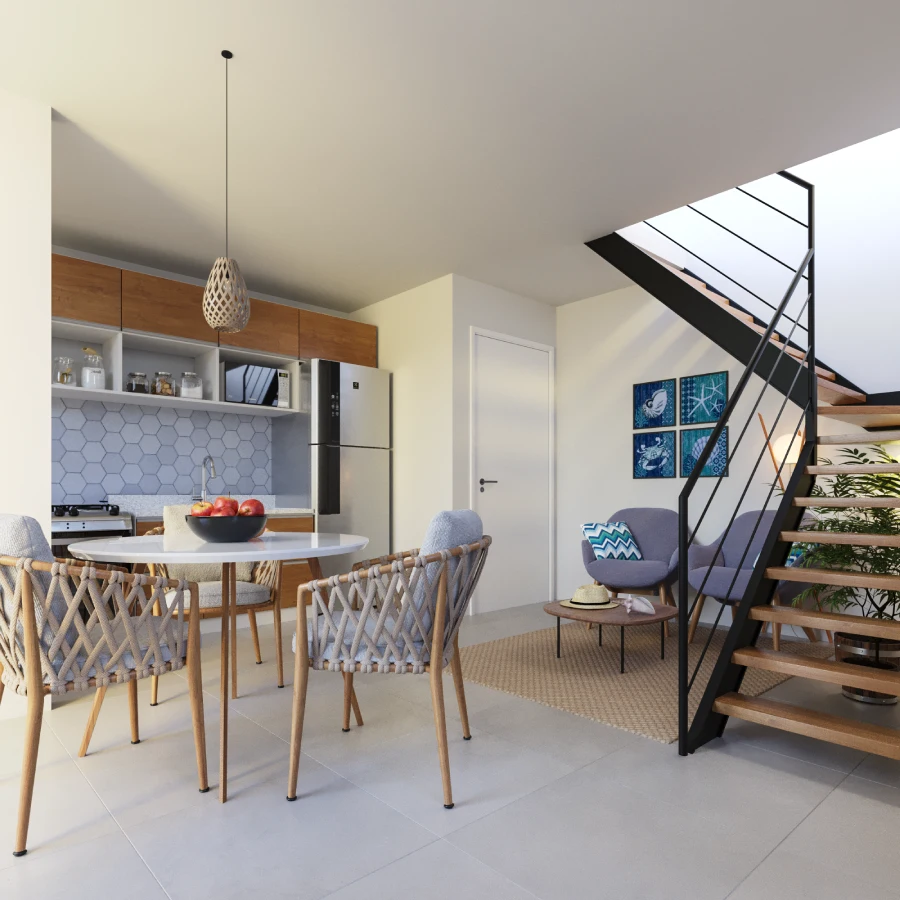 Descubra plantas versáteis, de 2 e 3 dormitórios, com metragens de 61 a 123m². Cada opção é projetada para se adaptar ao seu estilo de vida, destacando suítes, churrasqueira na varanda e a liberdade do seu apê pertinho da praia.