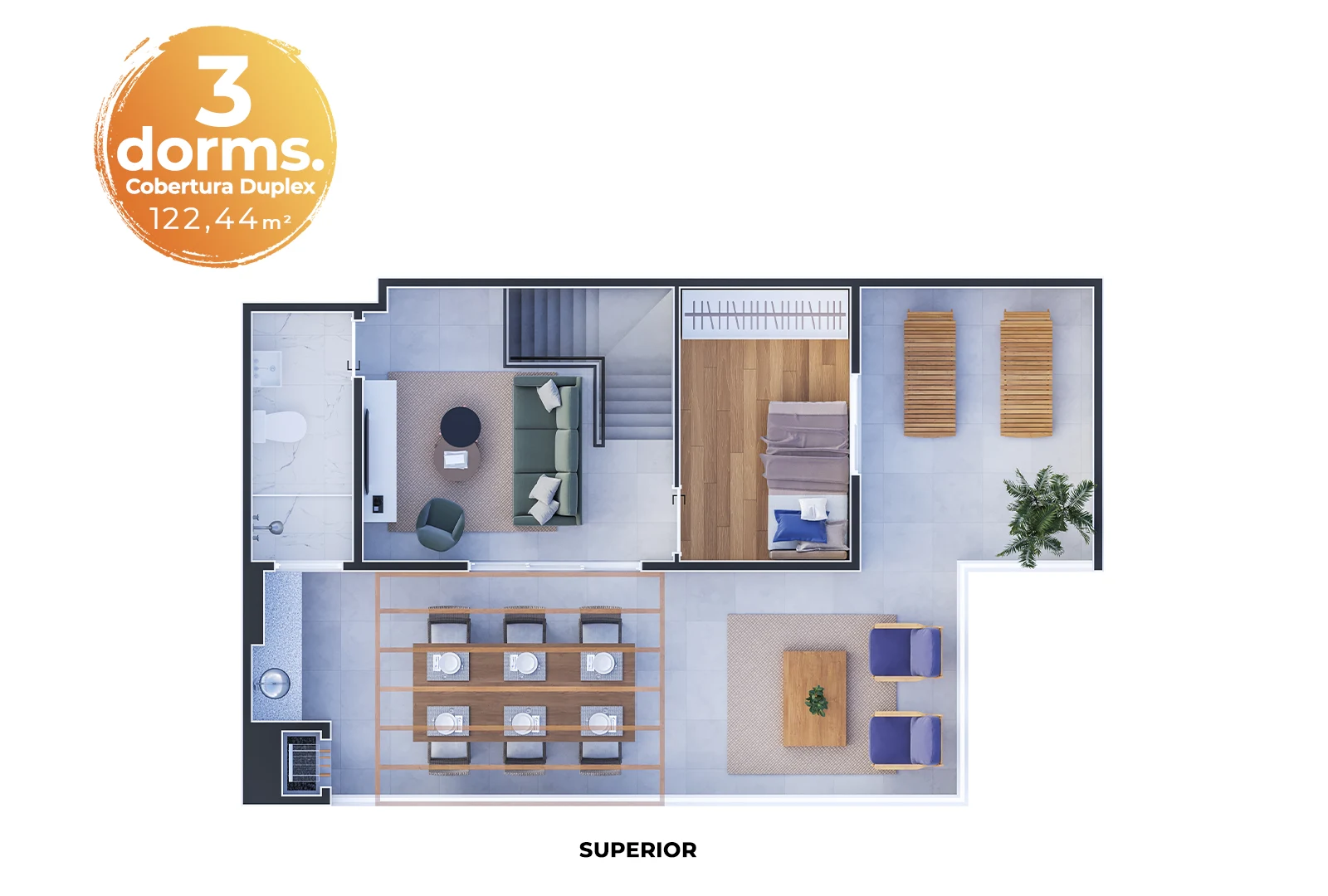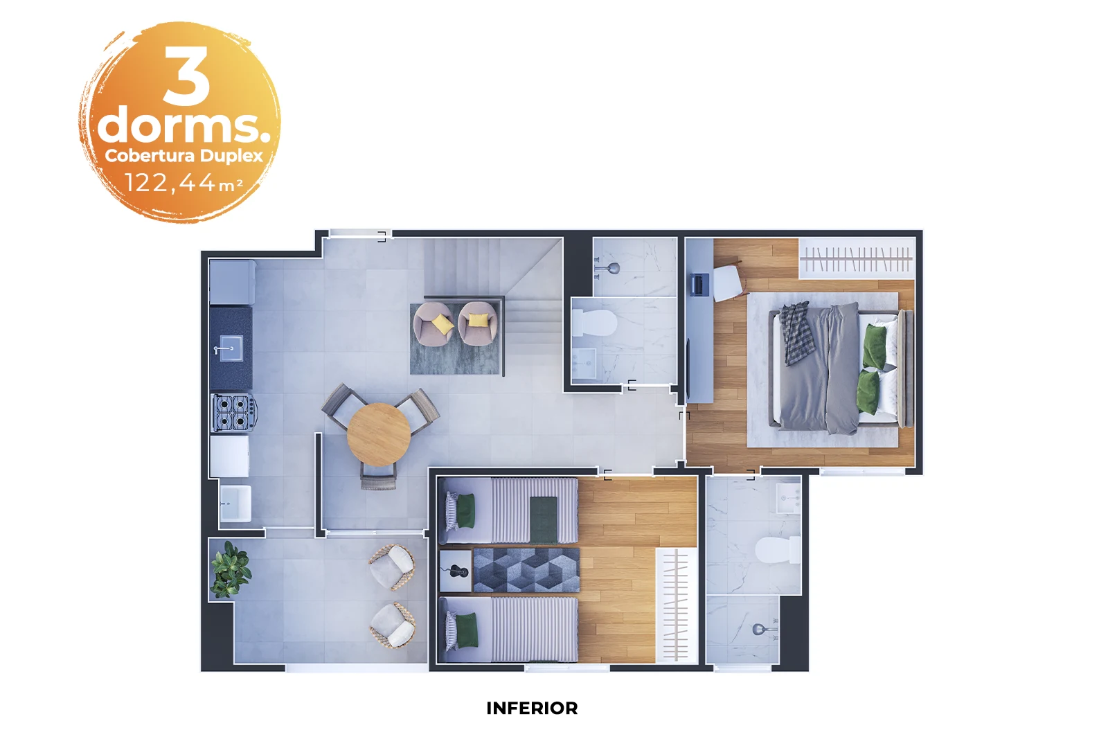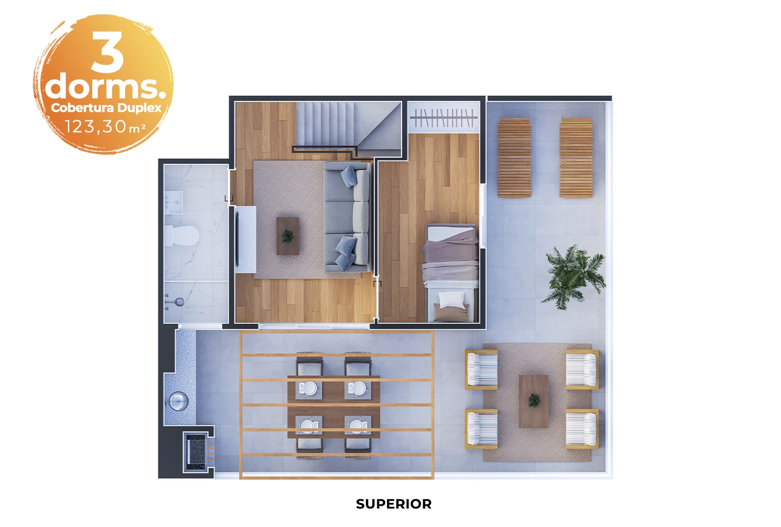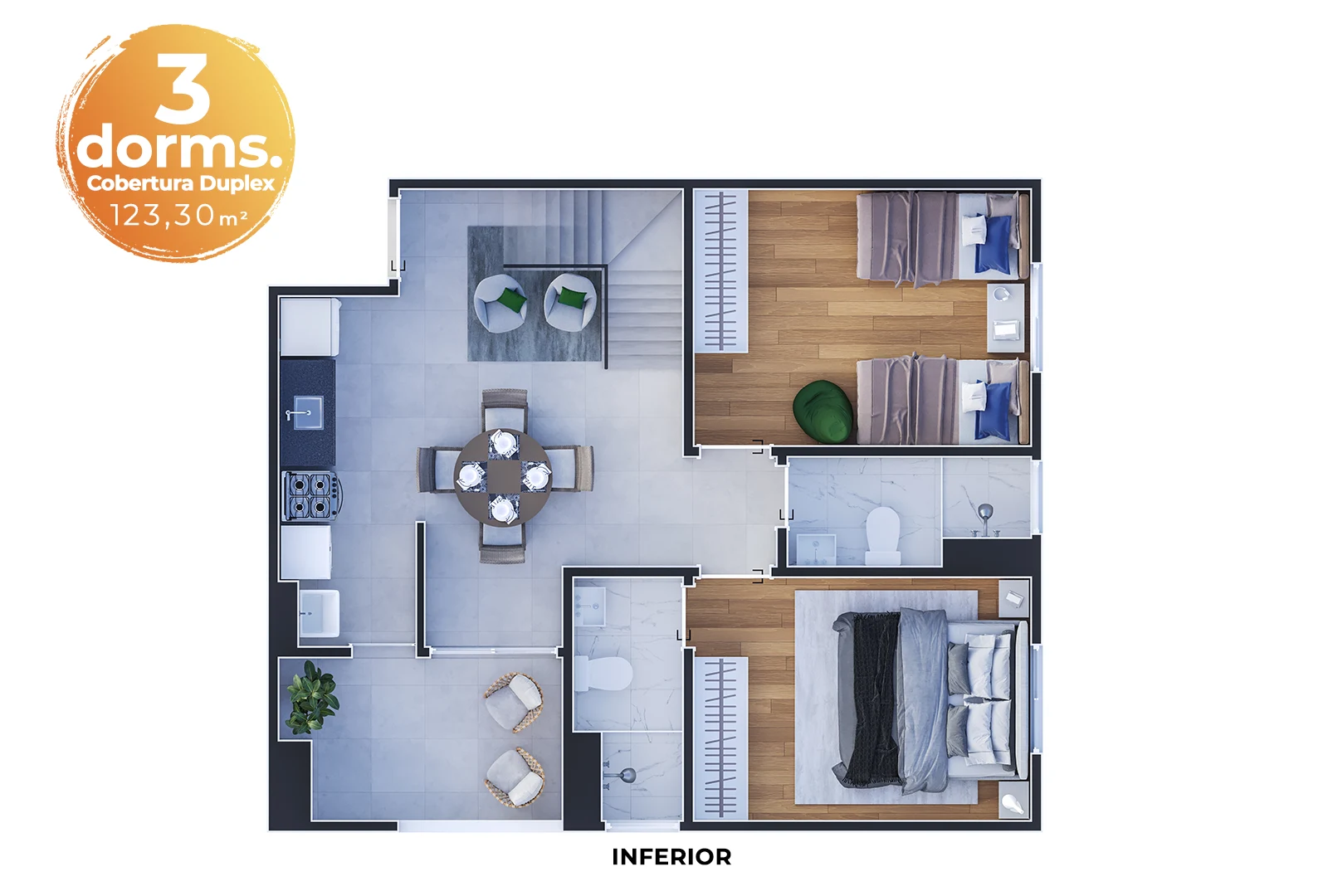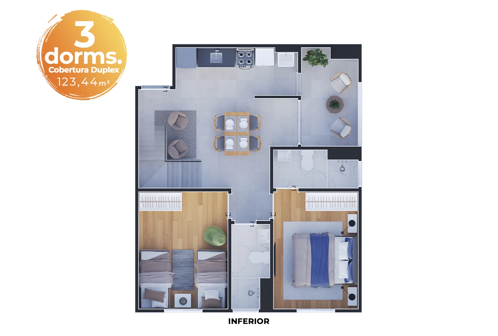 Descubra plantas versáteis, de 2 e 3 dormitórios, com metragens de 61 a 123m². Cada opção é projetada para se adaptar ao seu estilo de vida, destacando suítes, churrasqueira na varanda e a liberdade do seu apê pertinho da praia.